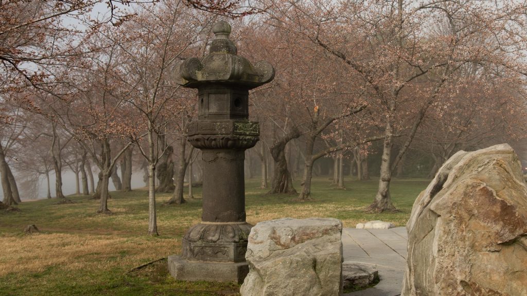 In 1954 the Japanese Stone Lantern was presented to Washington, DC as a gift to commemorate the 100th anniversary of America’s first treaty with Japan. It is lit only once a year during the Cherry Blossom Festival by the Cherry Blossom Princess representing Japan. Standing 8.5 feet tall and weighing approximately 4,000 pounds it was carved nearly four centuries ago to honor the Third Shogun of the Tokugawa period. It stands 50 feet east of the first two cherry blossom trees planted by First Lady Helen Taft and Viscountess Chinda in 1912 and is on the National Register of Historic Places.